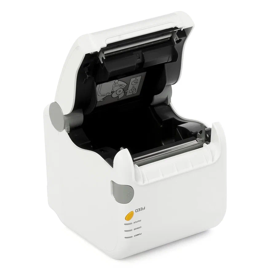 - Встроены датчики окончания бумажного носителя, крышки термоголовки, а также автоотрезчик ленты;