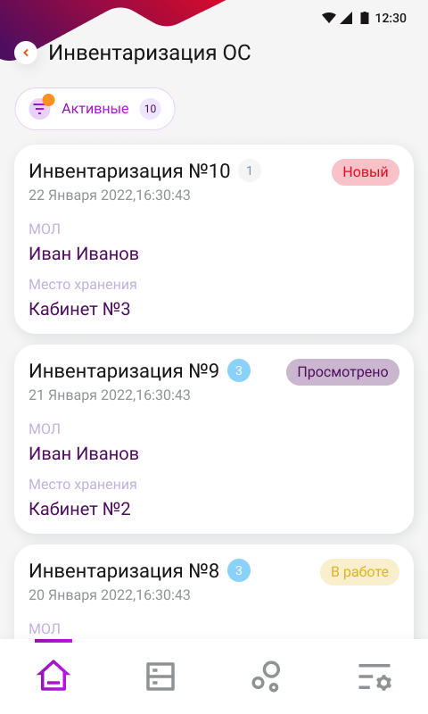 • Просмотр план-факта инвентаризации в реальном времени с цветовым обозначением активных позиций
