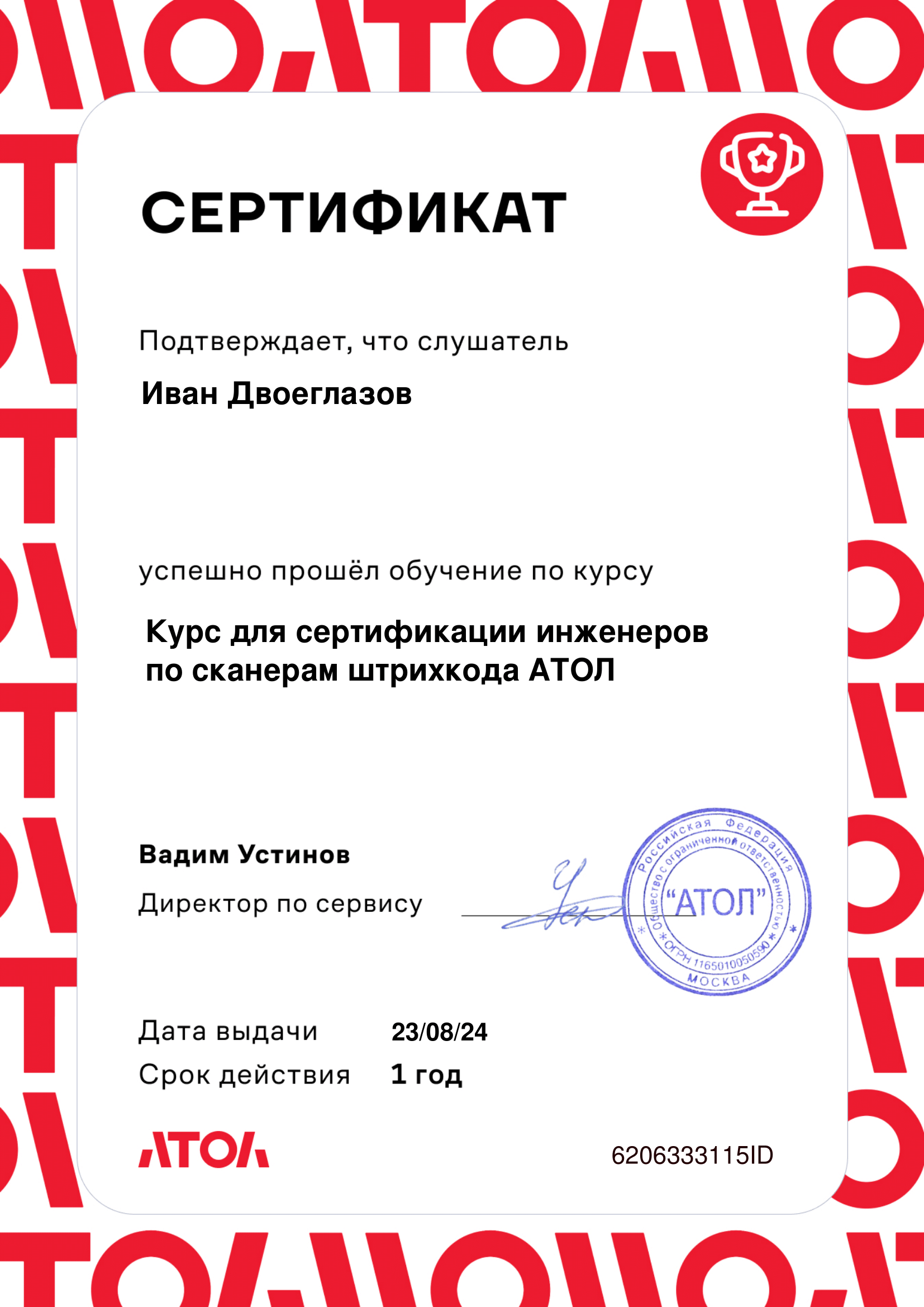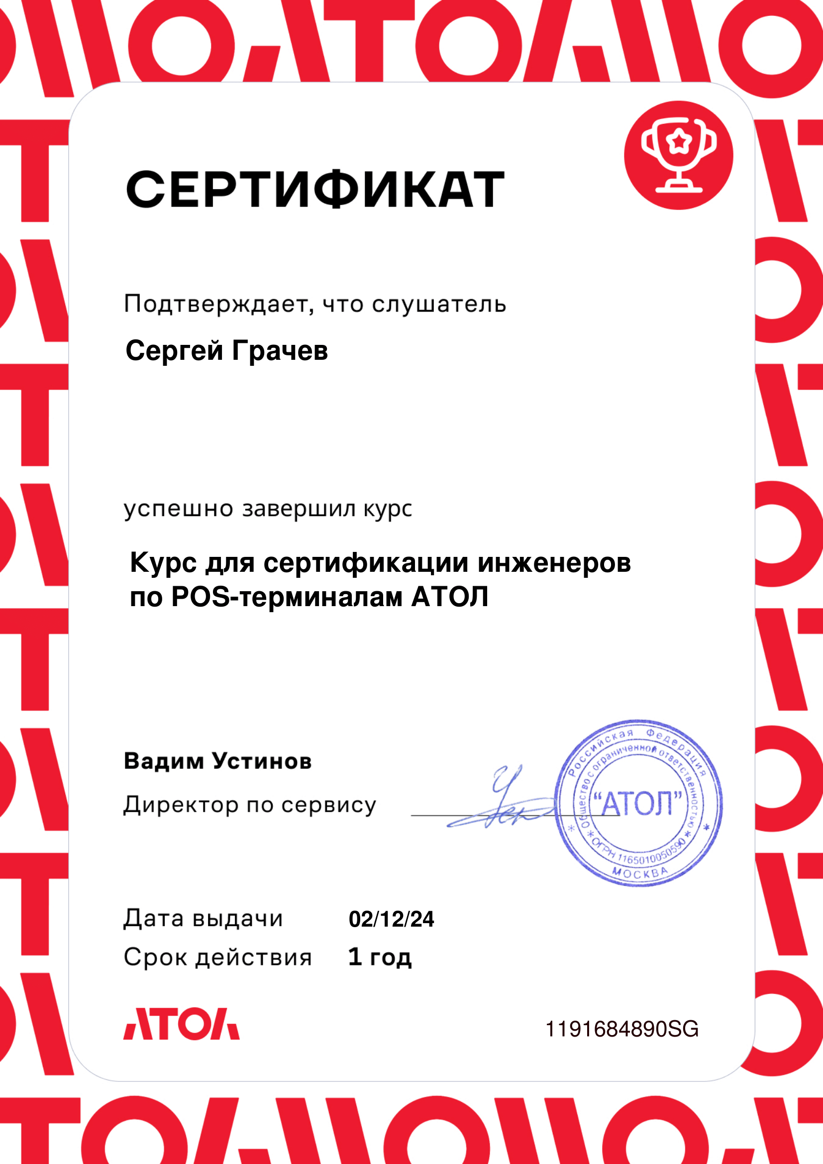 Сертификаты о прошедших курсах наших сотрудников от АТОЛ 4 кб